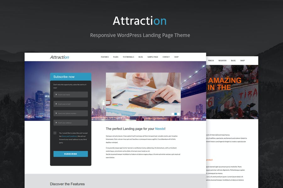 Attraction is a responsive one-page/multi-page WordPress landing page, built for promoting and selling products, services or events.