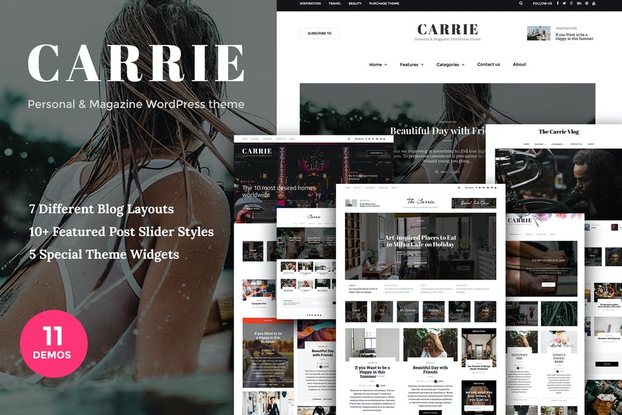 Carrie is a very stylish, elegant and powerful multipurpose WordPress blog theme perfect for any personal blog. Theme has an unique design with a lot of options, that can help customizing you blog, changing fonts, colors, layouts, post views and more. Carrie’s stunning sliders (Built-in Slider and Slider Revolution included) and creative promo boxes offer a unique visual experience to showcase your content in different ways with responsive layouts optimized for all devices.