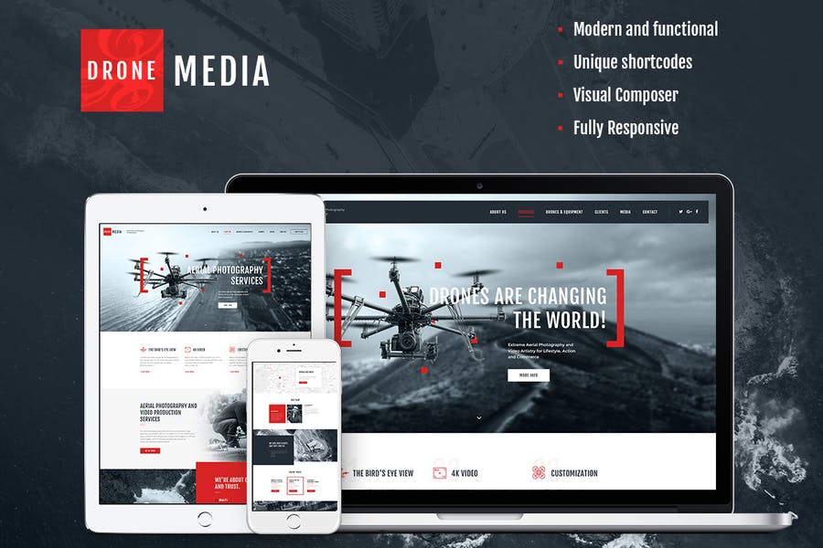 Drone Media is a new, fresh, stylish & trendy WordPress theme. It is focused on aerial photography and videography. The design has modern touch and feel, and it offers full pack of options to describe your services and expose all your projects. It is perfect for those who deal with photo shooting, video recording, event agency with camera operator services. It works for both corporate business & private organization.