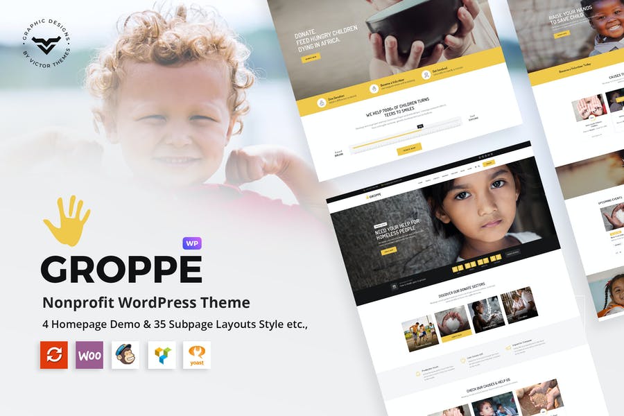 GROPPE – Charity / Non Profit / Fundraising WordPress theme. Groppe is fully functioned and fundraising charity WordPress theme that helps you to create a very attractive non-profit organization website. You can promote everywhere with highly featured donation plugin and enriched layouts that make people believe in causes. Awaken theme with enriched and numerous layouts for people who believe in transforming peoples life with charity.
